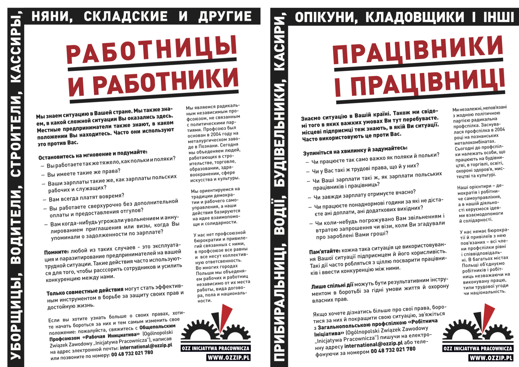 Если вы хотите узнать больше о своих правах, хотите начать бороться за них и тем самым изменить свое положение: пожалуйста, свяжитесь с Oбщепольским Профсоюзом «Рабочая Инициатива» (Ogólnopolski Związek Zawodowy „Inicjatywa Pracownicza”), написав на адрес электронной почты: Ten adres pocztowy jest chroniony przed spamowaniem. Aby go zobaczyć, konieczne jest włączenie w przeglądarce obsługi JavaScript. или позвоните по номеру: 00 48 732 021 780